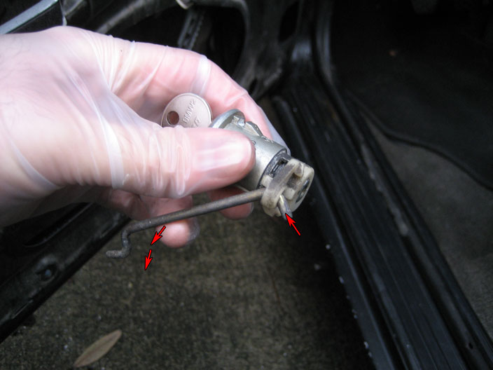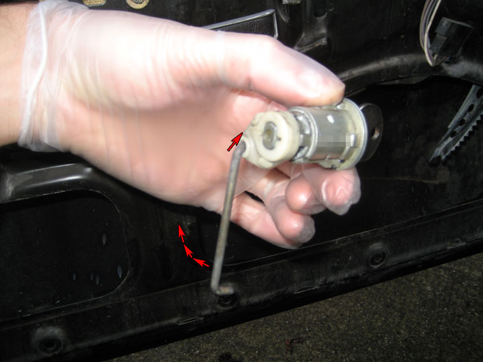 - Reinstallation is the reverse of removal. The circular plate has to be oriented in the right direction, so pay attention to the cuts on the sides. Also, remember that the pointy white plastic part on the back of the lock cylinder, to which the connecting rod attaches, should be pointing towards the rear of the car (when the door is closed).
