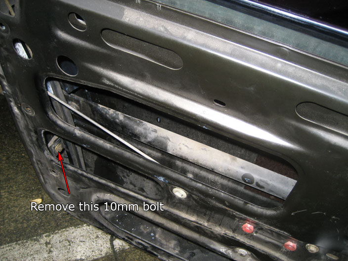 - First, unscrew the bolt that holds the window slide rail (10mm bolt):