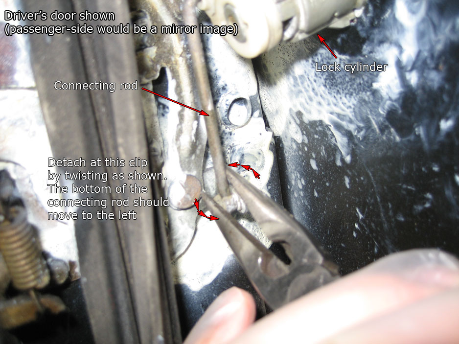 - Detach the bottom part of the connecting rod that connects the lock cylinder to the lock assembly (you need to detach it from its plastic sleeve (see zoom-in picture of the plastic clip below). Be careful not to break the plastic sleeve. It shouldn't take much force to pull the bottom of the rod straight towards you. I've found it's easiest to do that with a pair of pliers, as shown in the picture below: