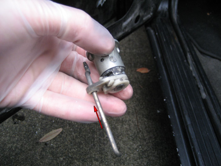 - At this point the door lock cylinder can slide out from the outside of the door, with the connecting rod still attached to it (you can fish it out).