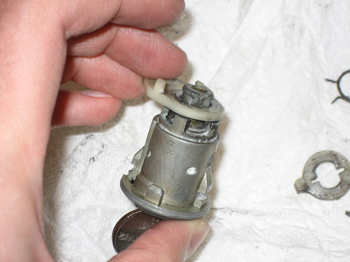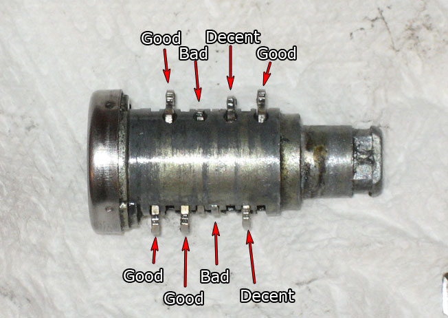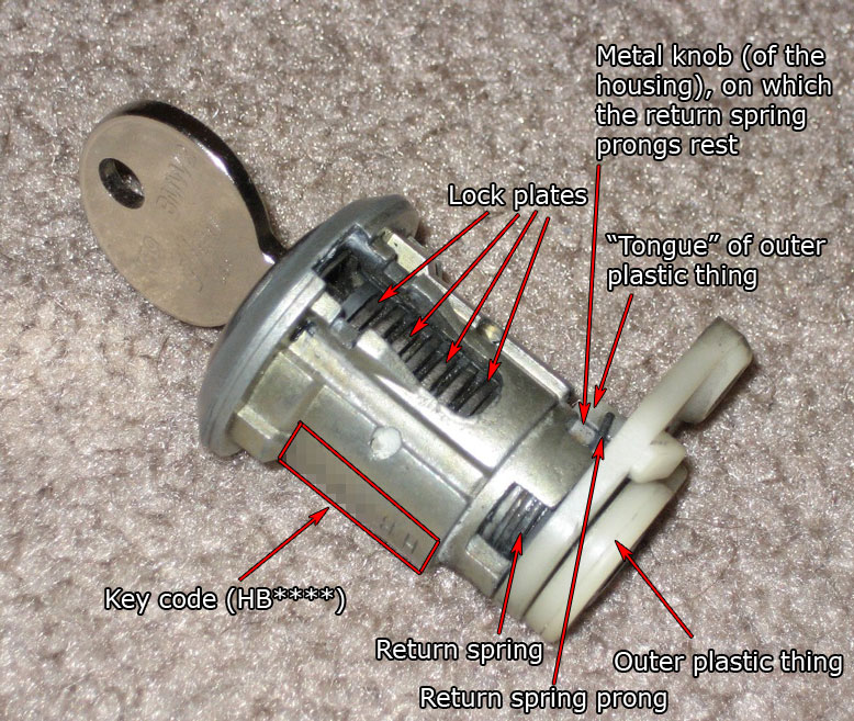 - Slowly pull out the key. The lock plates should all start sticking out now, 4 on each side. With the key out, push each lock plate inward with your fingers to make sure that it springs back. In my case, I had 2 of them not springing back properly (and 2 others decent, but not perfect), which was the cause of my locking problem. This picture shows non-springing plates: